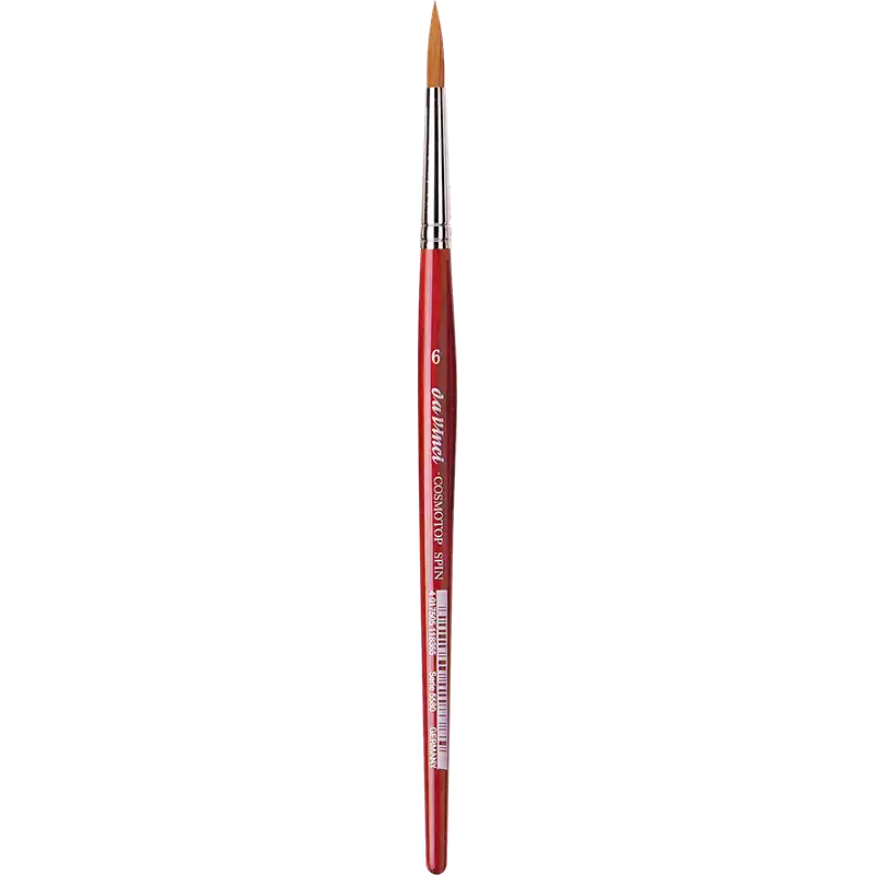 COSMOTOP-SPIN akvarel pensel Fineste, ekstra bløde, lysebrune syntetiske fibre Såkaldt sølv indfatning Kort, rød transparent lakeret sekskantet skaft Egnet til alle flydende farver, specielt til akvarelfarver og silkemaling For mere information om diverse mål mm - URL(http://www.vindelev-ramme.dk/_dk/Content/Data/Penselmaal/5580.pdf|MÅLSKEMA|new)END