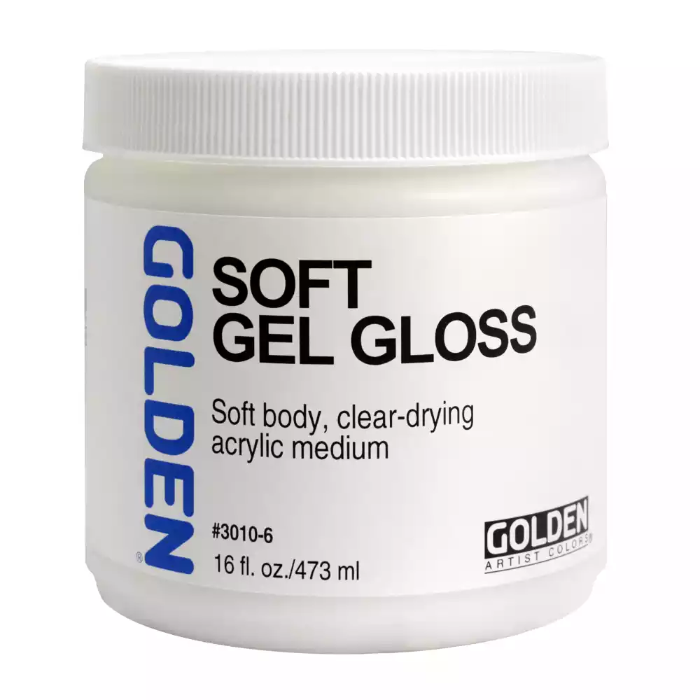 SOFT Gels er mere tyndtflydende end GOLDEN Heavy Body acrylfarver og kan hældes direkte ud af beholderen. Når den blandes med blot en lille mængde farve, fremstår den strålende blank. Soft gels kan bruges som basis til at fortynde med og også som lim til collager. SOFT Gel Gloss kan fortyndes med vand og pensles på som et uopløseligt, isolerende og gennemsigtigt lag, inden en opløselig slutfernis påføres.
