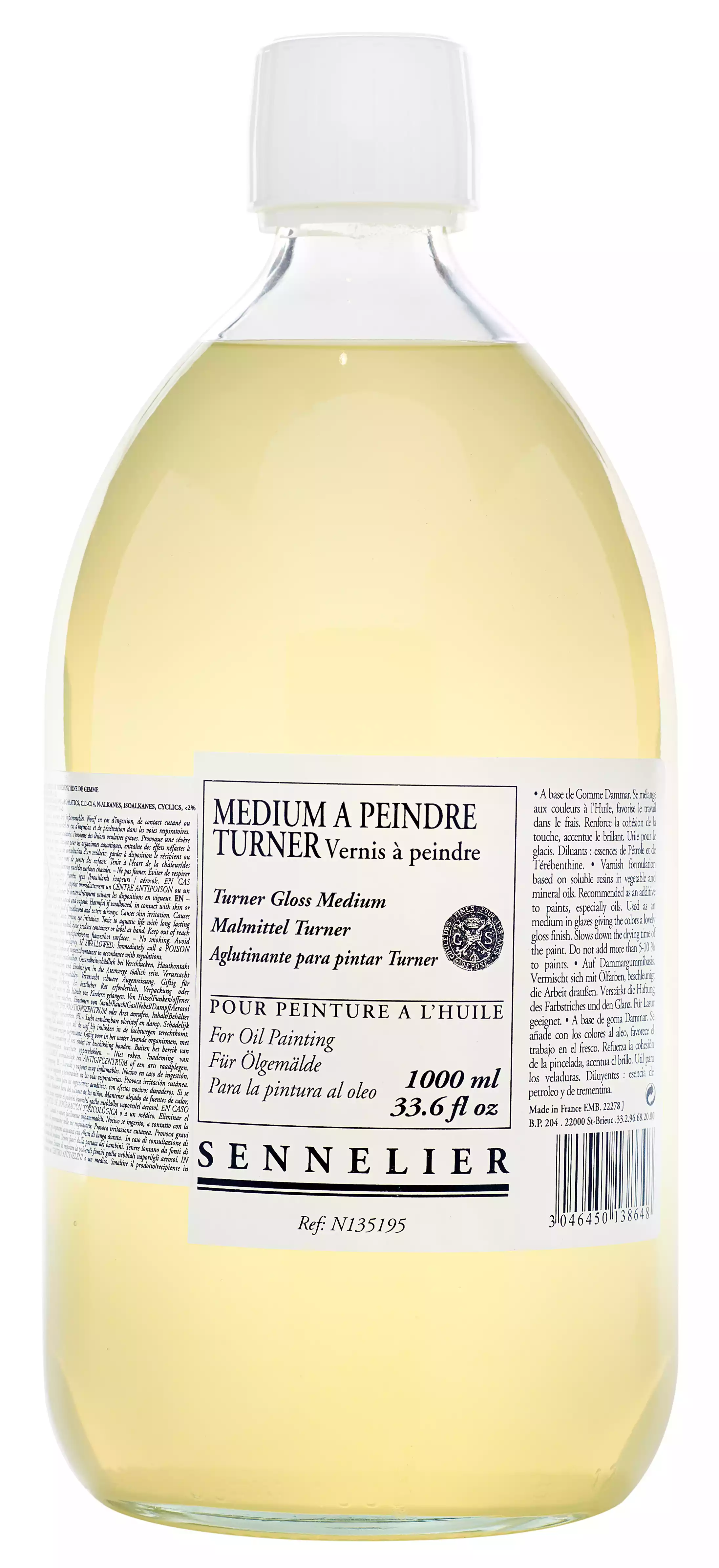 Turner malermedium (75 - 250 ml - 1 l) Et godt råd: Start med at male med rektificeret terpentin, bland derefter 1 del Turner malermedium med 1 del rektificeret terpentin, og tilsæt til sidst rent eller let fortyndet Turner malermedium. Baseret på Dammaraharpiks (naturlig harpiks). Kan blandes med oliefarver i alle proportioner. Særligt velegnet til at arbejde med frisk maling. Styrker penselstrøgenes ensartethed og gør maleriet mere glansfuldt. Nyttigt til glasering og gennemsigtigt lavering. Fortyndere: mineralske fortyndere og terpentin. Dette medium er klart til brug og kan anvendes under hele maleprocessen.
