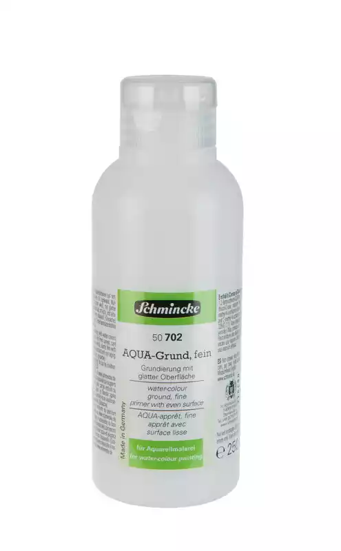 AQUA primer fin. Danner et glat underlag til akvarelmaling. Kan bruges på forskellige slags underlag, som fx opspændte lærreder, maleplader, træ mm. Primer'en kan indfarves med akvarelfarve på tube eller akrylfarve. Påfør mindst 3 lag primer/grunder (fin) med pensel eller rulle. Rens redskabet med sæbe og vand umiddelbart efter brug! Først når den grundede flade er helt tør, kan der males på den.