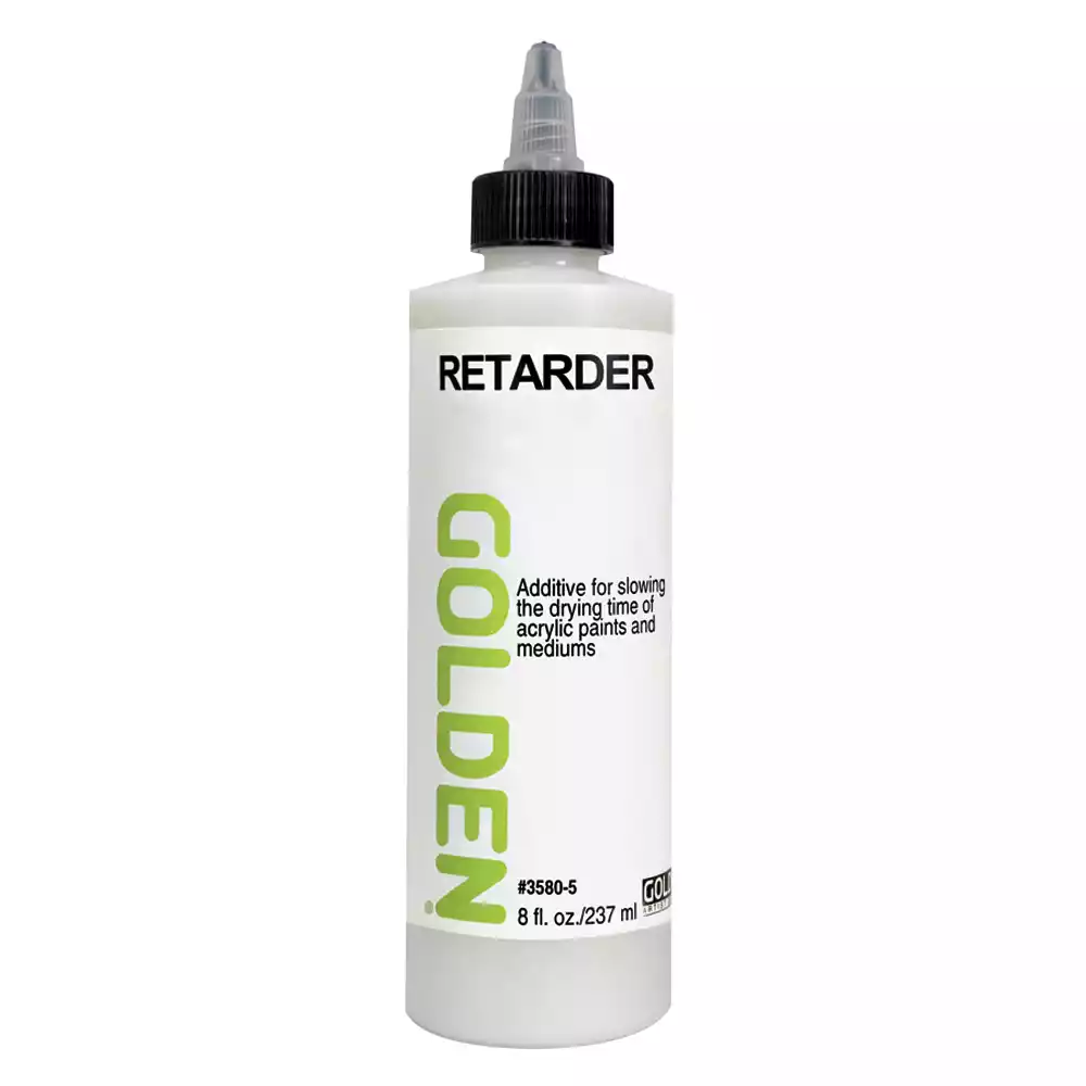 RETARDER er et tilsætningsstof som bruges til at forøge acrylfarvernes tørretid. Nyttig ved vådt i vådt teknikker og til at forhindre at farverne danner skind på paletten.