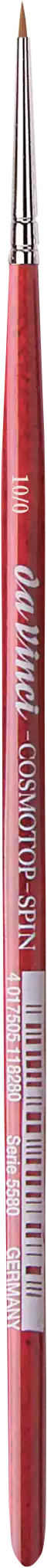 COSMOTOP-SPIN akvarel pensel Fineste, ekstra bløde, lysebrune syntetiske fibre Såkaldt sølv indfatning Kort, rød transparent lakeret sekskantet skaft Egnet til alle flydende farver, specielt til akvarelfarver og silkemaling For mere information om diverse mål mm - URL(http://www.vindelev-ramme.dk/_dk/Content/Data/Penselmaal/5580.pdf|MÅLSKEMA|new)END