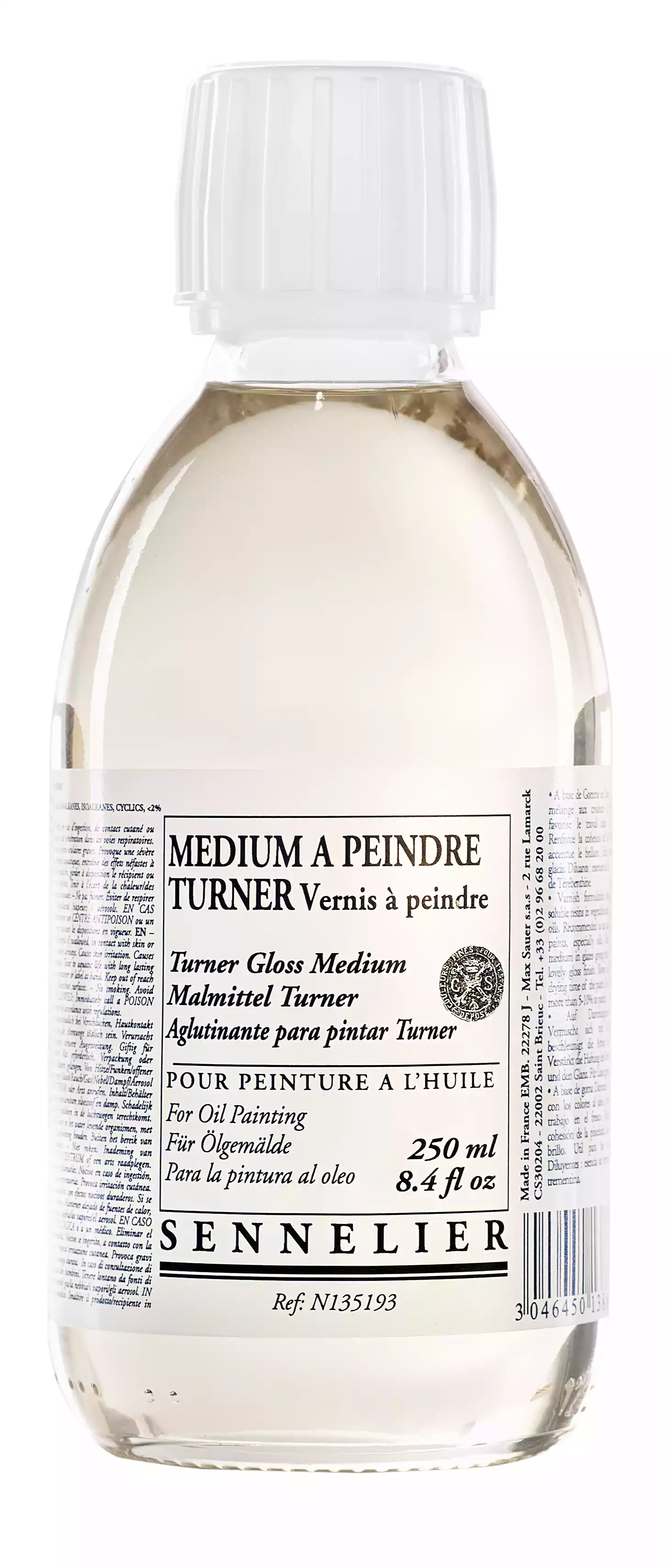 Turner malermedium (75 - 250 ml - 1 l) Et godt råd: Start med at male med rektificeret terpentin, bland derefter 1 del Turner malermedium med 1 del rektificeret terpentin, og tilsæt til sidst rent eller let fortyndet Turner malermedium. Baseret på Dammaraharpiks (naturlig harpiks). Kan blandes med oliefarver i alle proportioner. Særligt velegnet til at arbejde med frisk maling. Styrker penselstrøgenes ensartethed og gør maleriet mere glansfuldt. Nyttigt til glasering og gennemsigtigt lavering. Fortyndere: mineralske fortyndere og terpentin. Dette medium er klart til brug og kan anvendes under hele maleprocessen.