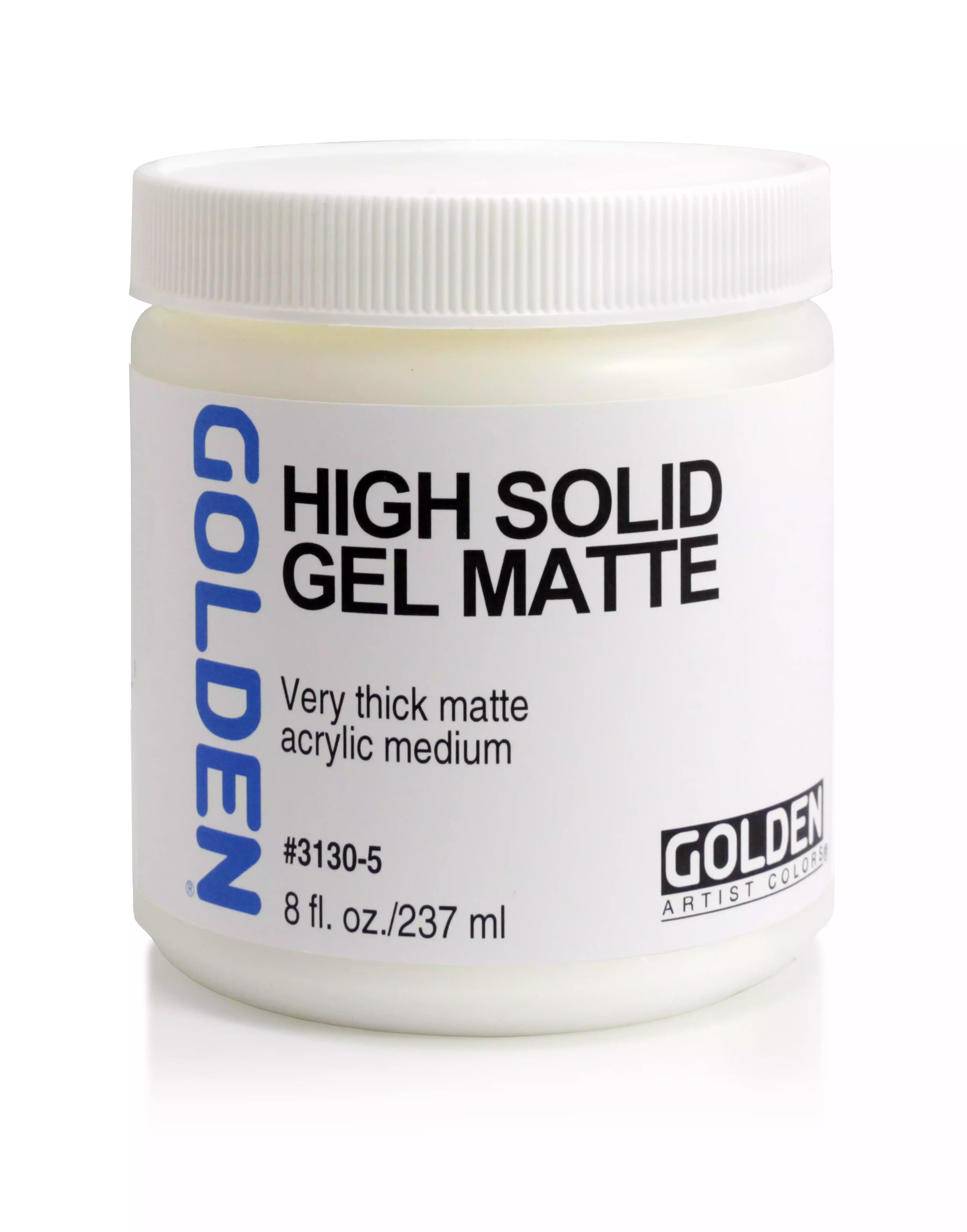 High Solid Gels har samme konsistens som Extra Heavy Gels. Fordi de indeholder forholdsvis mindre vand og mere acryl tørstof, kryber de mindre end andre gels. High Solid Gels er gode at blande med farver og kan bevare spor af penselstrøg, når de tørrer. For kunstnere der ønsker en acrylfarve der reagerer som en oliefarve er denne gel den helt rigtige. High Solid (Gloss) fremstår glasklar når den tørrer. High Solid (Matte) får en tåget, voksagtig finish