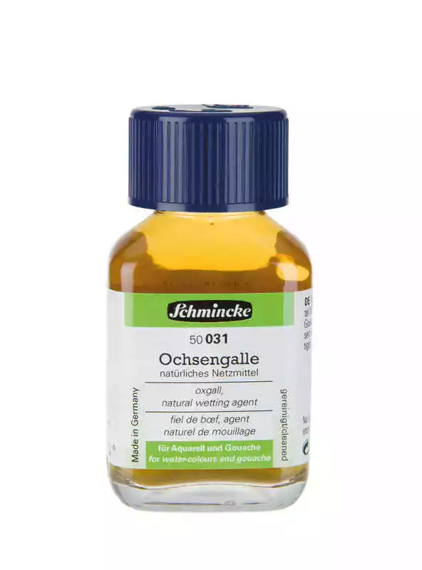 Oxgall, renset. Naturligt middel til affedtning af underlag før der males med akvarel eller gouache. Brugt i små mængder er det velegnet som afspændingsmiddel i akvarelfarver. Oksegalden har en tendens til, med tiden, at klumpe lidt sammen, men det påvirker ikke vedhæftningsevnen af farverne.