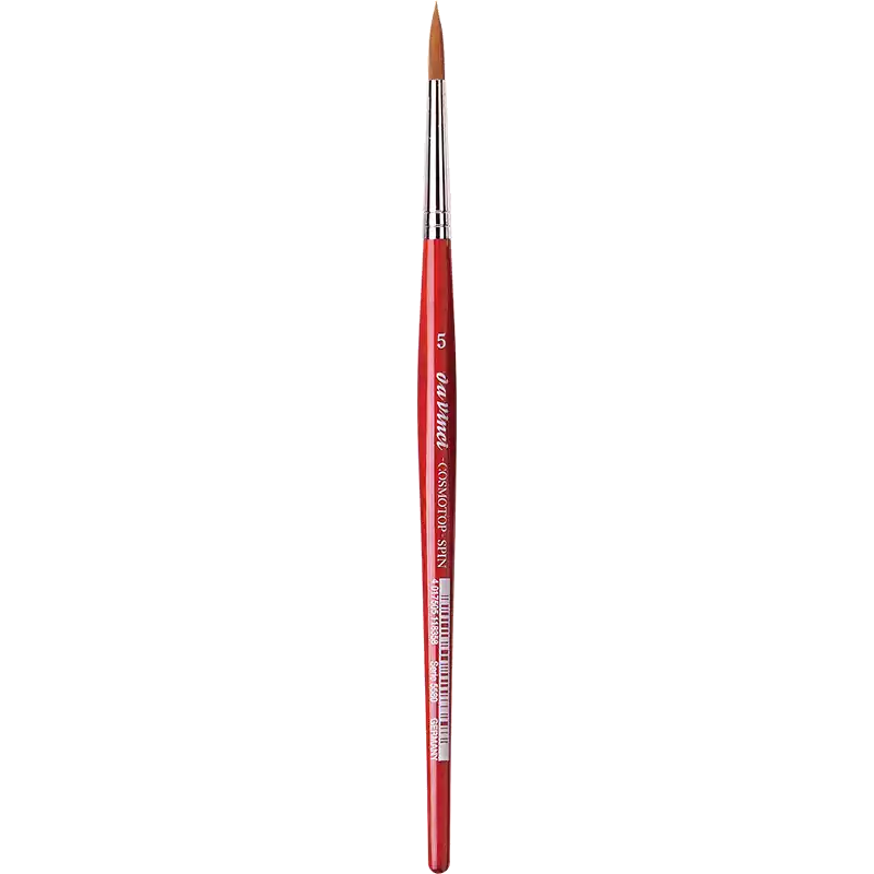 COSMOTOP-SPIN akvarel pensel Fineste, ekstra bløde, lysebrune syntetiske fibre Såkaldt sølv indfatning Kort, rød transparent lakeret sekskantet skaft Egnet til alle flydende farver, specielt til akvarelfarver og silkemaling For mere information om diverse mål mm - URL(http://www.vindelev-ramme.dk/_dk/Content/Data/Penselmaal/5580.pdf|MÅLSKEMA|new)END