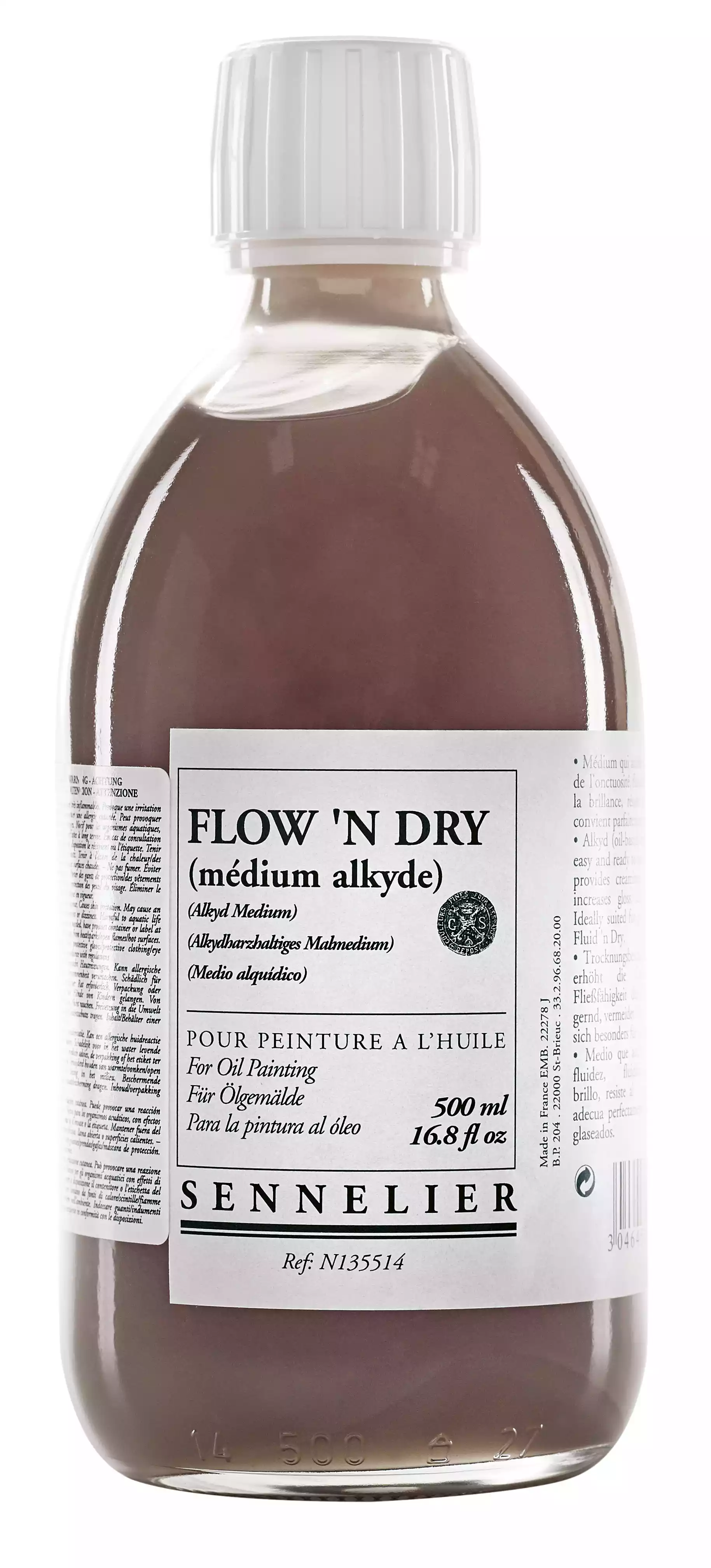 Flow 'n Dry (alkydmedium) (75 - 250 - 500 ml - 1 l) Dette medium accelererer "tørringsprocessen" meget og er særligt nyttigt for dem, der kan lide at arbejde hurtigt. Modificeret alkydoliemedium giver en let gelagtig konsistens, forbedrer tykkelsen af maleriets finish, accelererer tørringsprocessen og gør pastaen mere flydende takket være de thixotropiske egenskaber. Giver et glansfyldt finish, gulner ikke, er meget velegnet til glasering og blandinger i enhver proportion med oliefarver. Velegnet til almen anvendelse og friluftsstudier (Plein air).